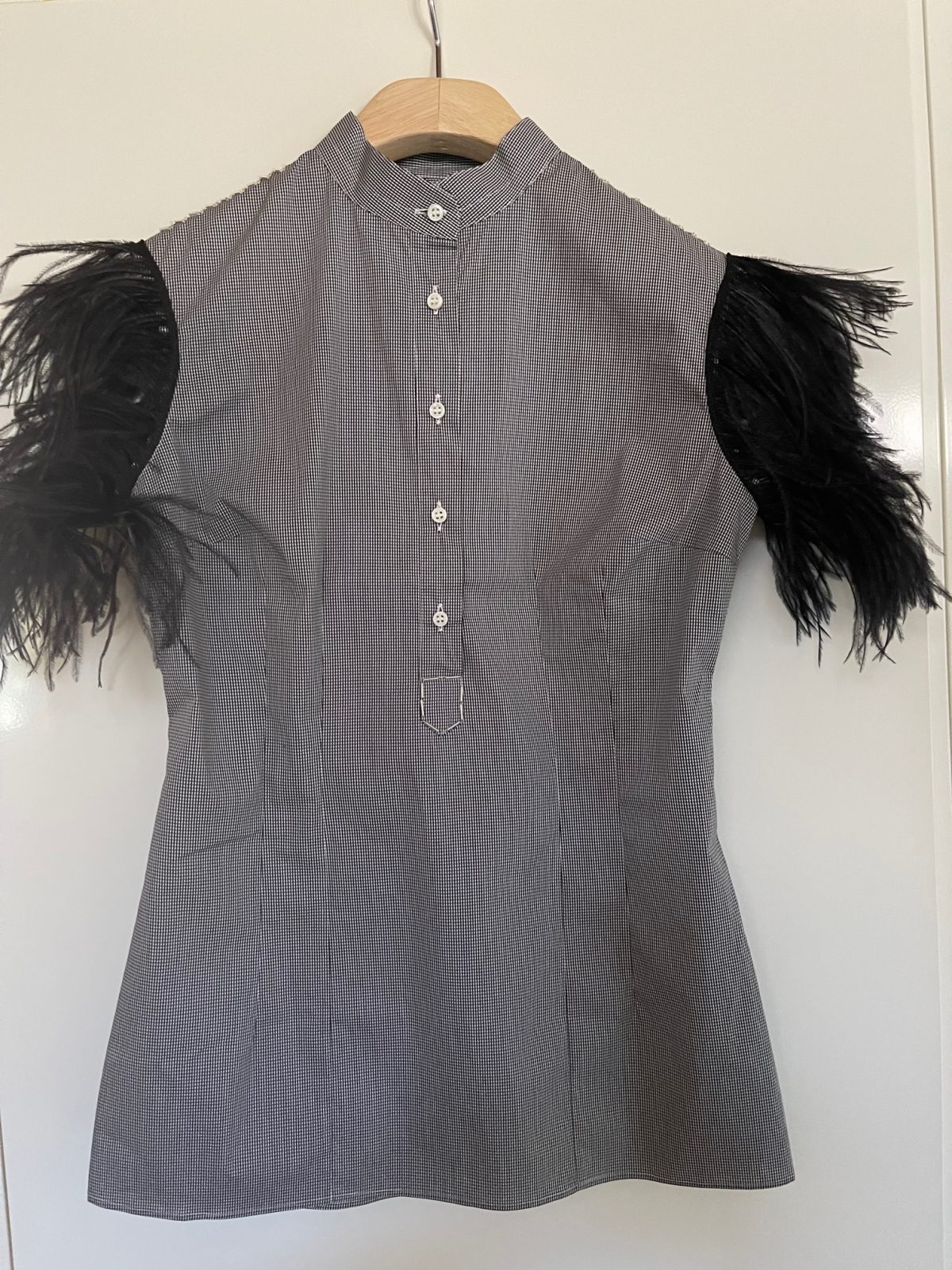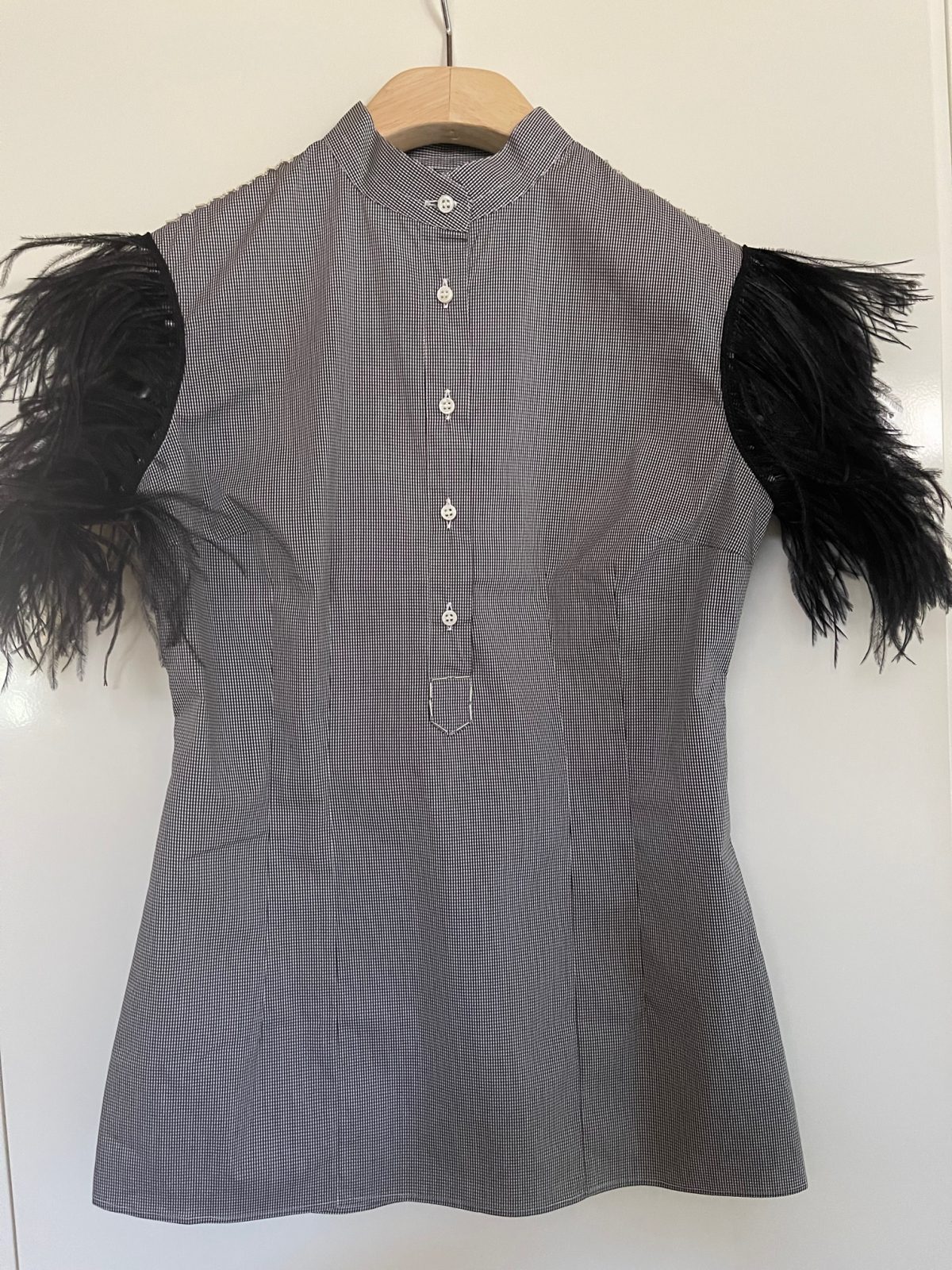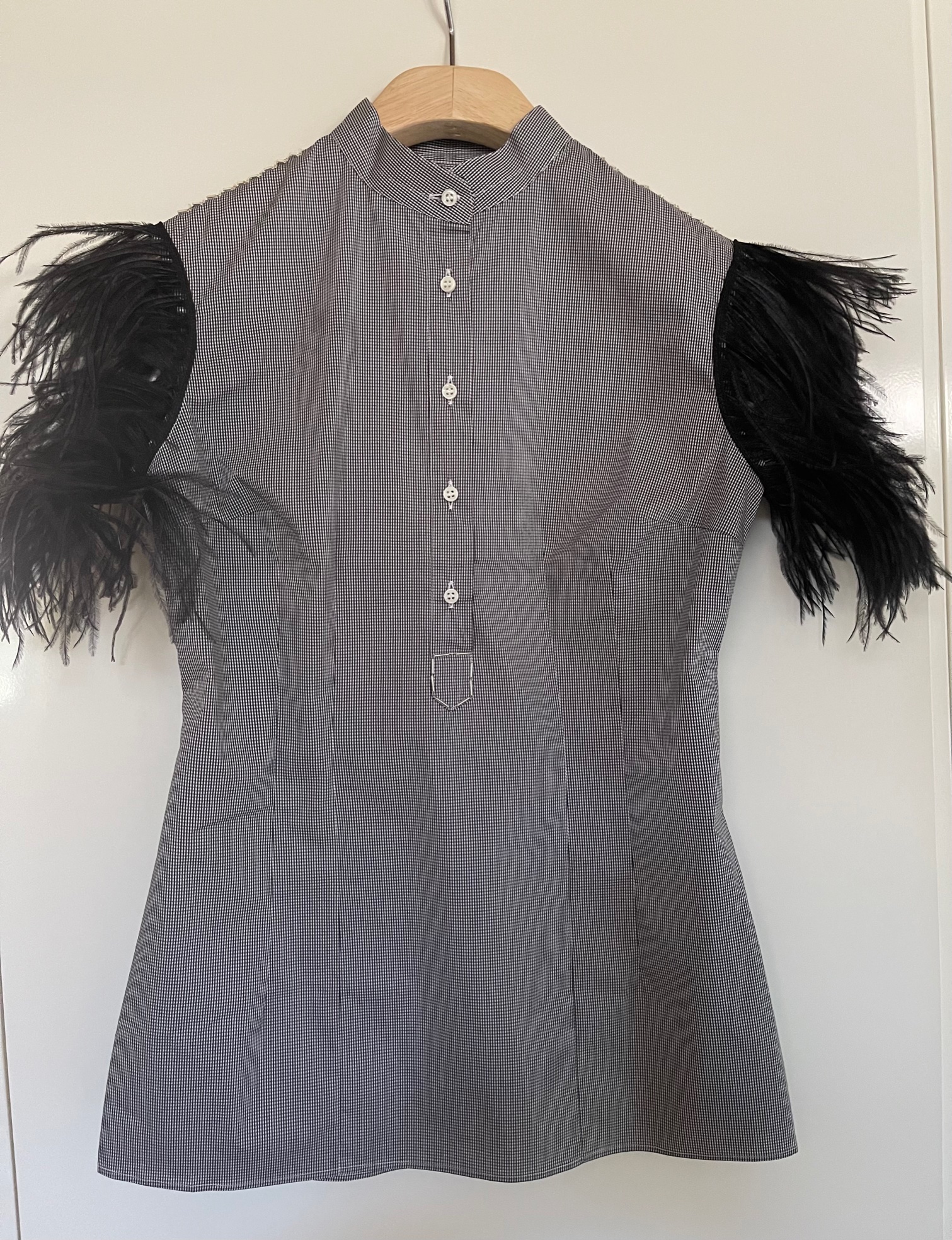 MODELLO SENZA MANICA CON COLLO A LISTINO E BOTTONI A POLO, RICAMO A PAILETTES TUBOLARI SULLA SPALLA E SULLA CHIUSURA BOTTONI, LE PIUME SULLA MANICA RENDONO QUESTO CAPO MOLTO FASHION.