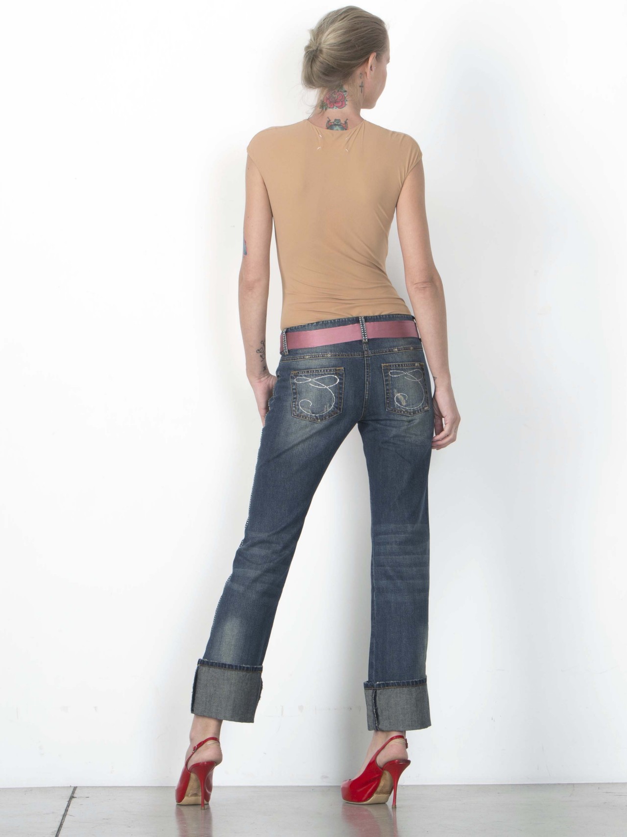 JEANS CON SWAROSKI TRUST TOILETTE, MODELLO JEANS DI LINEA DIRITTA E ASCIUTTA  CON SWAROVSKI APPLICATI E CINTURA A NASTRO IN SETA ROSA. UN PASS PER GLI ABBINAMENTI PIU’ GLAMOUR E CHIC, COOL