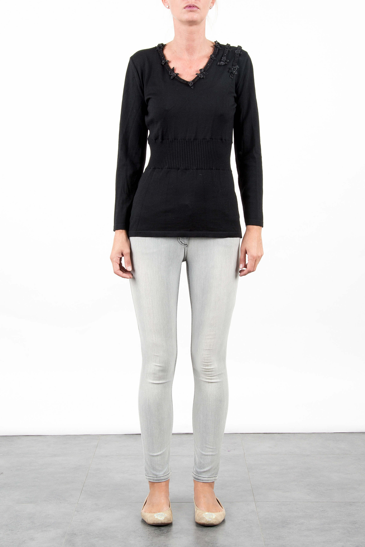 MAGLIA CON RICAMO MIMMA TRICOT, SCOLLO A V CON RICAMO A ROSELLINE ALLO SCOLLO. DI LINEA SLIM E CONFORTEVOLE CON FASCIA IN VITA A COSTE PER SOTTOLINEARE LA FIGURA. QUESTO PULLOVER ELEGANTE E RAFFINATO PER OGNI OCCASIONE DA GIORNO E DA SERA, BON TON E CHIC