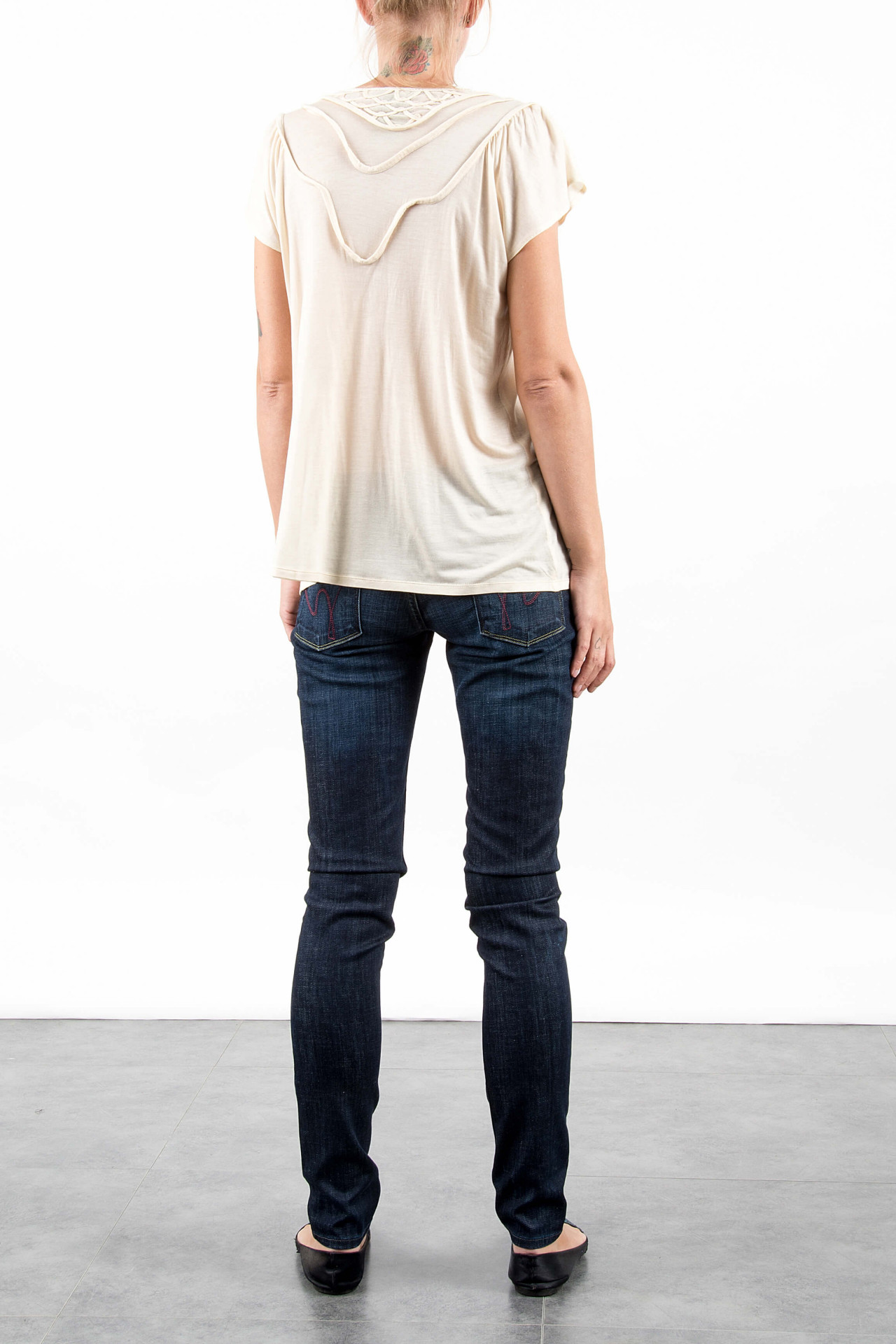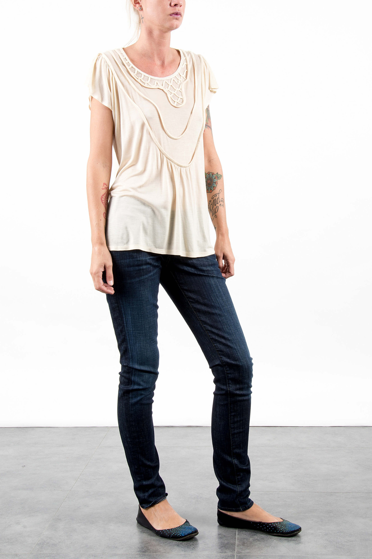 MAGLIETTA ELEGANTE CON NERVATURE TSUMORI CHISATO, CON NERVATURE E RICAMO ALLO SCOLLO E ARICCIATURA SUL DAVANTI, RENDONO QUESTO CAPO PARTICOLARE ED ELEGANTE PER OGNI OCCASIONE GLAM E COOL FOREVER